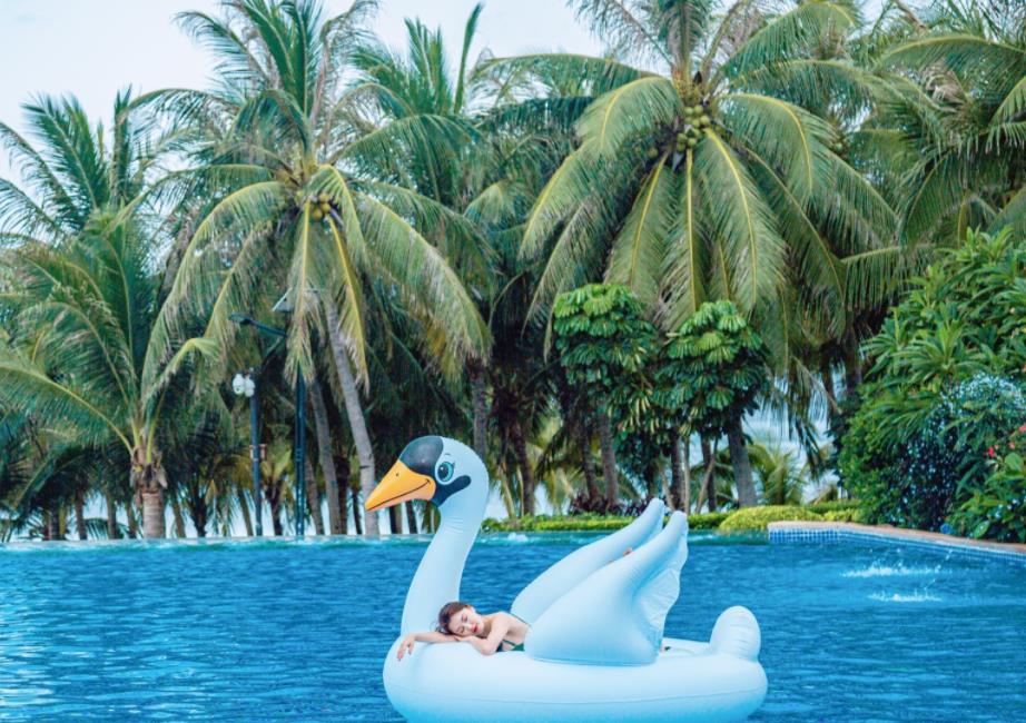 泳池里放了一只比人还高大的充气大鹅,她一会儿趴在大鹅上,享受悠闲的时光,一会儿装作跟大鹅玩耍,尽显童趣,整个画面很是吸睛,让人一下子移不开眼睛。