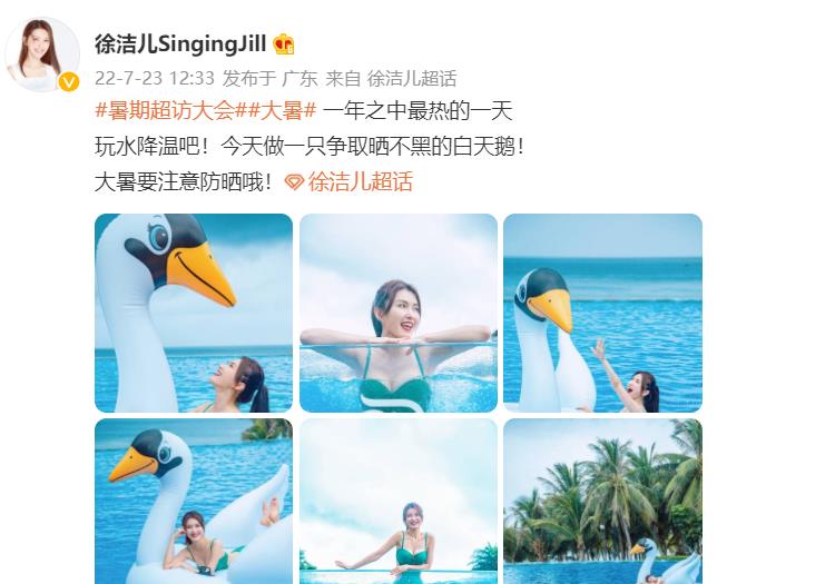 徐洁儿写道,一年之中最热的一天玩水降温吧,要做一只争取晒不黑的白天鹅,大暑要注意防晒哦。