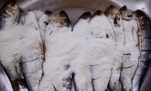 5、准备另外一个干的盘子,倒上适量的面粉,然后腌好的每一条海鲫鱼都要在面粉上面滚一下,让海鲫鱼裹上一层面粉,不需要太厚,薄薄一层就可以了。