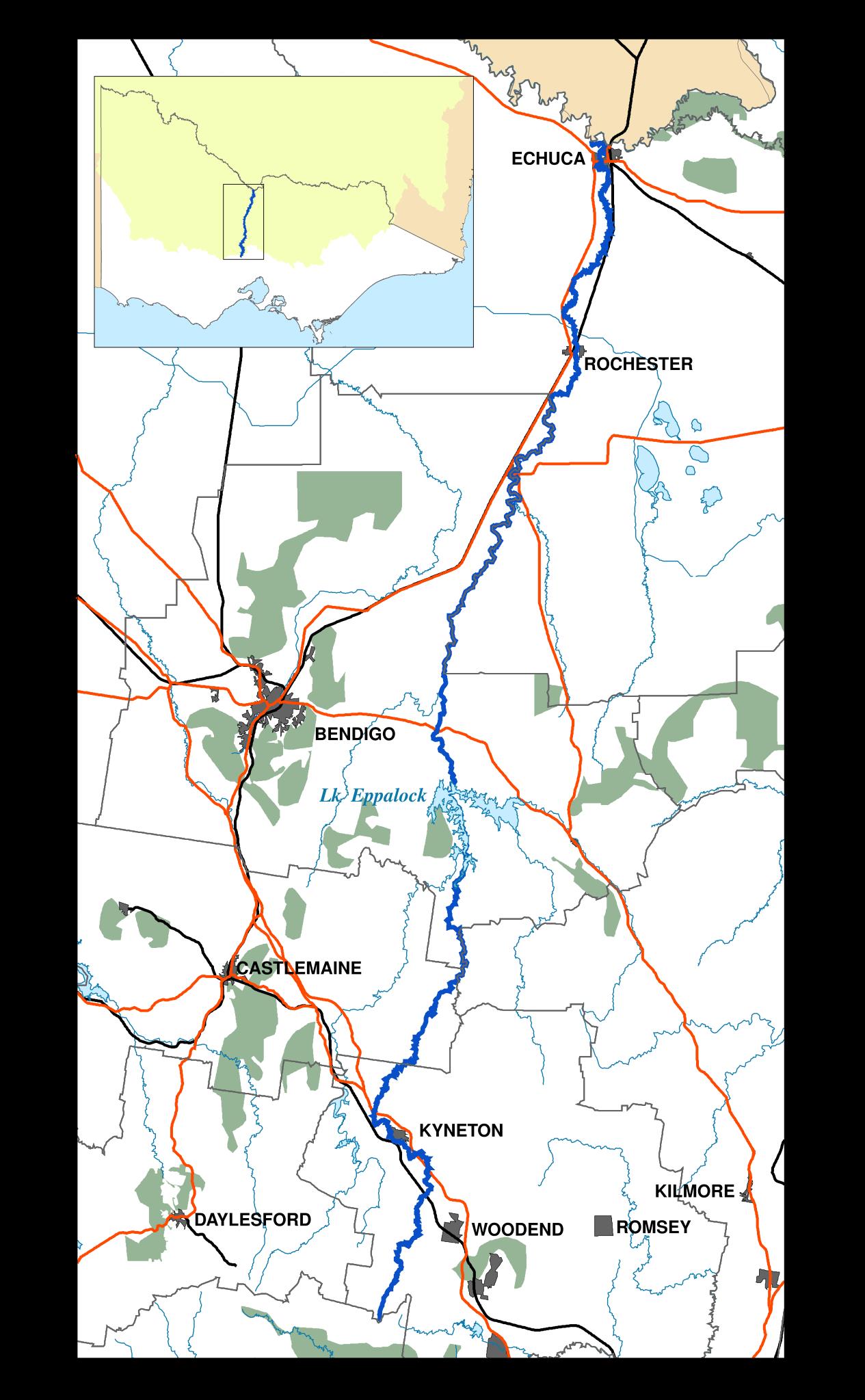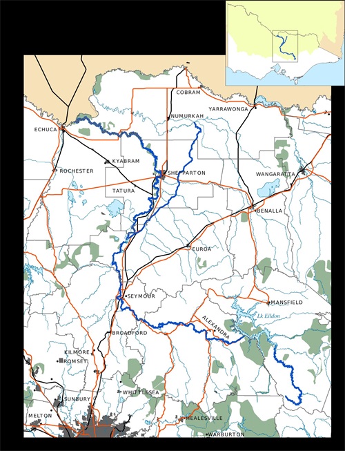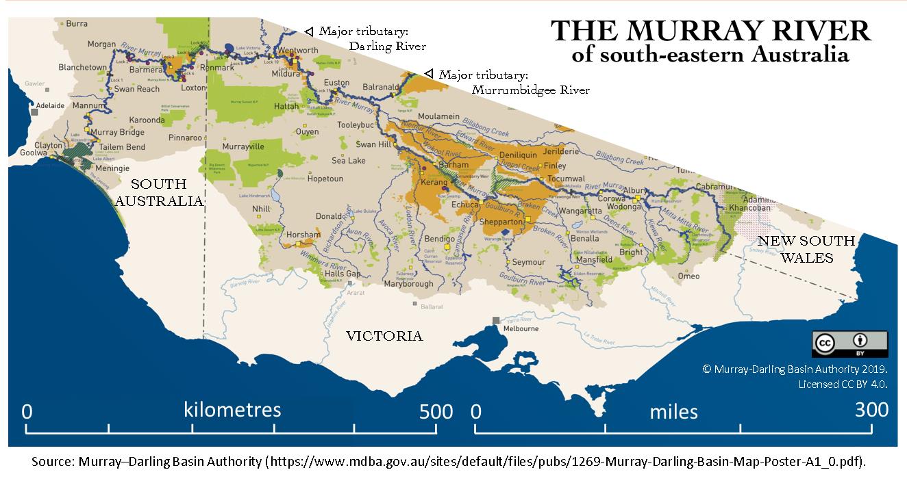 墨累河是全长3750公里的墨累-达令河水系的一部分,该水系流经维多利亚州、新南威尔士州和昆士兰州南部的大部分内陆地区。墨累河的平均流量767立方米/秒,只占世界其他地区同等规模河流的一小部分,而且流量的年变化很大,曾三度在极端干旱期间完全干涸。