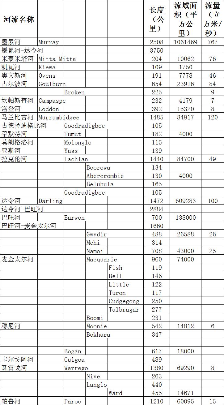 达令河的其他支流还有瓦雷戈河(河长1380公里,流域面积69290平方公里)、帕鲁河(河长1210公里,流域面积60095平方公里)等。