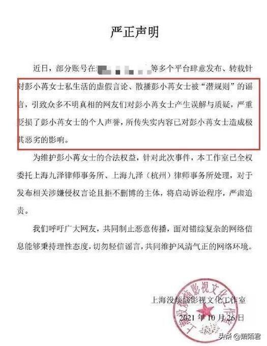 对此,彭小苒工作室第一时间发文辟谣,并要求删除不当言论,不然将追究法律责任。