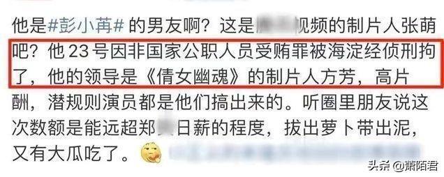 彭小苒与制片人张萌传出过绯闻,两人曾手挽手一起同回酒店。去年10月,有消息称,张萌因为受贿被抓了。甚至还传出,张萌曾潜规则多位女演员,这下让绯闻女友彭小苒也躺枪了。