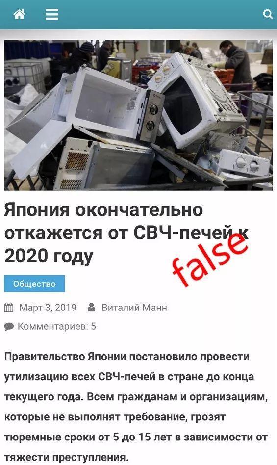 但经过记者查询,并未在日本媒体的公开报道中找到相关信息,更别提中韩两国对于微波炉的禁令了。其实,这篇消息是出自于俄罗斯讽刺新闻网站Panorama.pub的一篇恶搞文章,内容纯属捏造,只是借助虚构新闻来进行讽刺,然而却被许多媒体转载,一时之间,谣言满天飞。现在经过鉴定可以知道了,这是假消息。