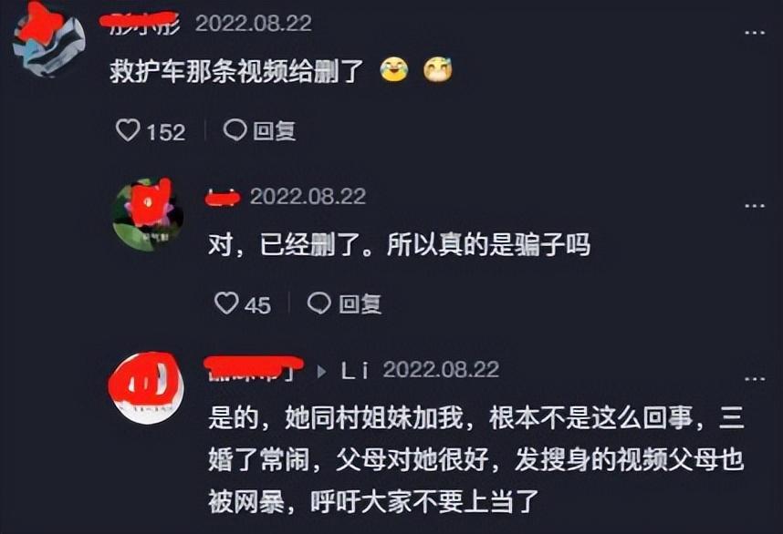 除此之外,有网友发现,星姐的账号上,把她自己在救护车上的那段视频给删除了。后来,有自称跟星姐是同村的人爆料,星姐没有喝药,也没有住院,这一切都是她自导自演的。