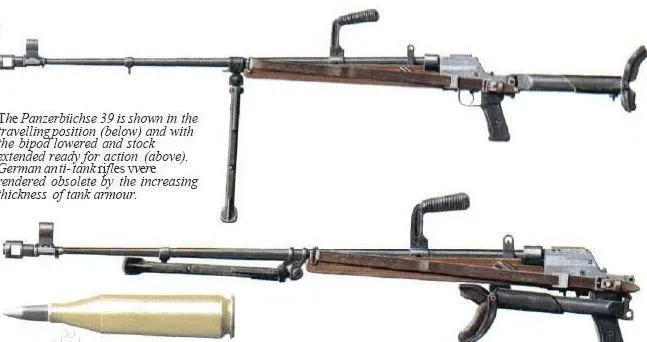 德国PzB39反坦克枪,,发射相同的7.92×95mm枪弹,随着坦克装甲厚度的增强,反坦克步枪的发展处于萎缩状态,PzB39与其他反坦克步枪一样,截短了枪管,在枪管的前面装一个榴弹发射器,改成用枪榴弹!