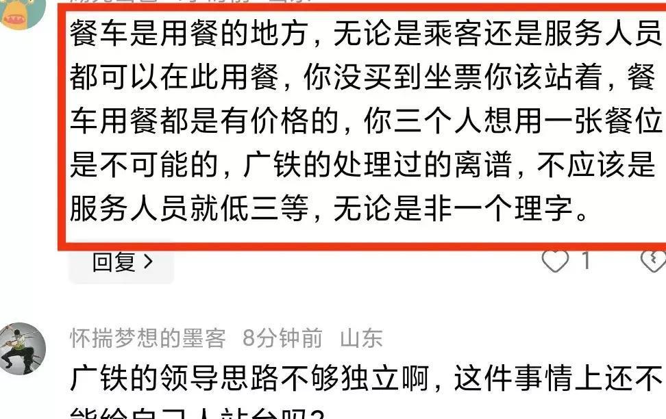 事件的发展令人震惊。 大家开始质疑负责该次列车的广铁集团,是否调查过事件的来龙去脉,是否明确规定了列车餐车的使用规则,是否对列车餐车进行了保护。指挥者的合法权益。 而广铁处罚的依据是什么? 而不是仅仅根据一个视频就得出结论。