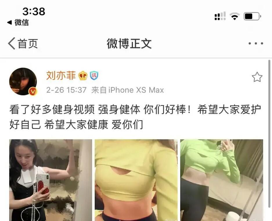 近日刘亦菲在微博和网友互动,写道:“看了好多健身视频 强身健体 你们好棒!希望大家爱护好自己 希望大家健康 爱你们”。