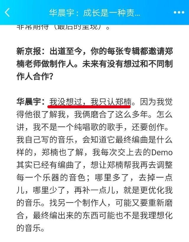 郑楠超激动回应:我太想做点厉害的音乐了!两人一拍即合,从2014年华晨宇第一张专辑开始一直合作到现在,中途有人问花花有没有想过和不同的制作人合作,而花花坚定地表示:我没想过,我只认郑楠。