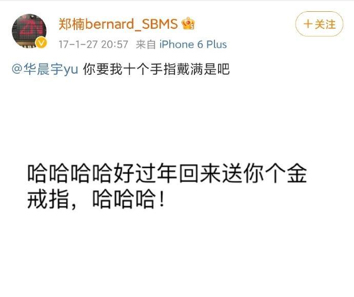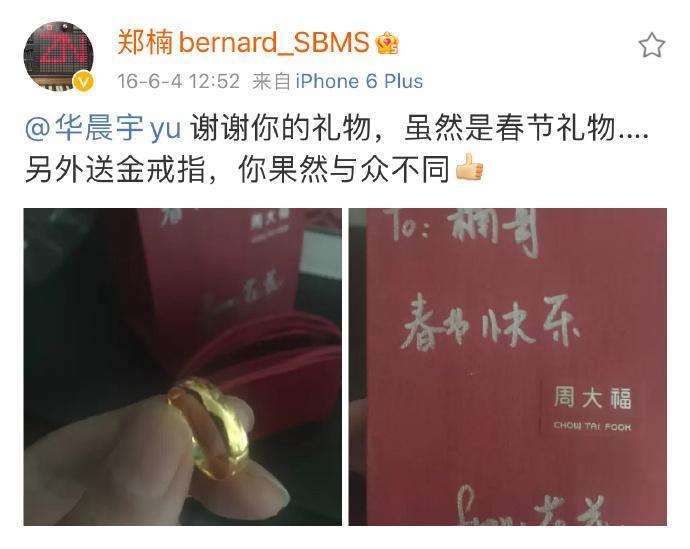 华晨宇送郑楠金戒指的故事得从16年说起,在一个炎热的夏日里,郑楠更新微博分享花花送出的礼物,竟然是春节礼物!这大夏天的,一个大老爷们送另一个大老爷们金戒指,实在是太好玩啦!