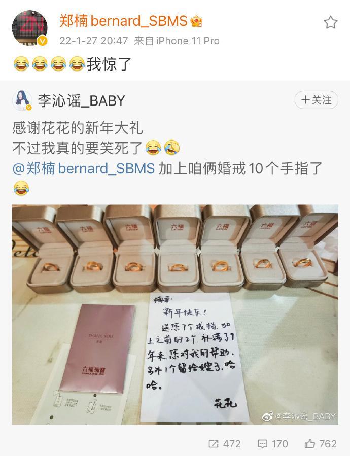 故事到17年还有续集,花花又送了郑楠一个金戒指,郑楠回应:你要我十个手指戴满是吧?没想到还真是说中了,在2022年,郑楠老师如愿戴满了十个手指的金戒指。