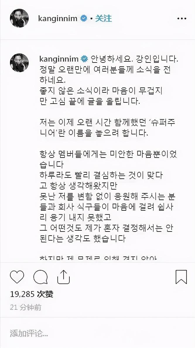在去年的7月份时,久违露面的强仁,突然在社交媒体上发布了退团宣言。他在文中写到:“虽然太晚了,但我要放下Super Junior这个名字。一直以来对于成员都只有感到十分的抱歉。想到那些还在支持不中用的我的粉丝,以及公司的同仁,让我一直无法鼓起勇气离开。但是我不能再这样拖下去了。未来将独自走下去,我会在心里刻上对不起还有谢谢走出去。”