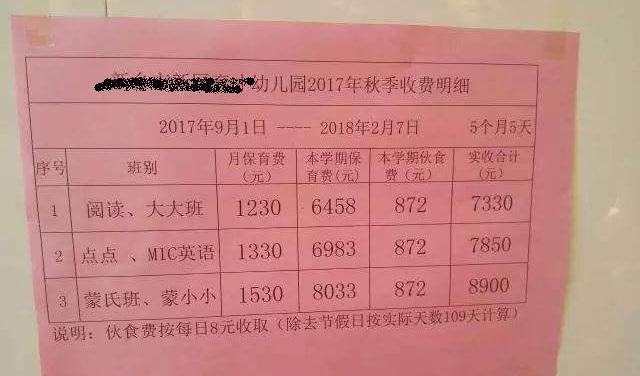 我们先来看看城市幼儿园学费清单。虽然这不是最后一年的学费标准,但据了解,学费每年都在上涨,所以2年前的学费就达到了7330元到8900元的标准。每天8元。家长送孩子上学五个月需要花费近万元,大致相当于当地的工资。也就是说,工资足以支付没有吃喝的孩子的学费。