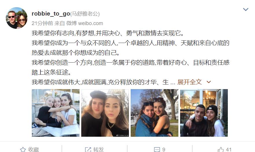 马舒雅的老公在中国生活了9年,中文进步巨大,听说读写都没有任何障碍了,文中这一段长文表爱对女儿的祝愿,用词非常准确可见中文功底很深厚,言语中尽显为人父的责任与担当,对女儿关爱备至。