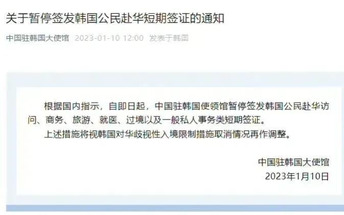 1月10日,中国忍无可忍,采取坚决的反制措施。从即日起,暂停办理韩国公民赴中国的所有私人事务类短期签证。
