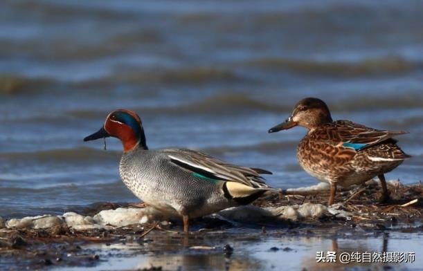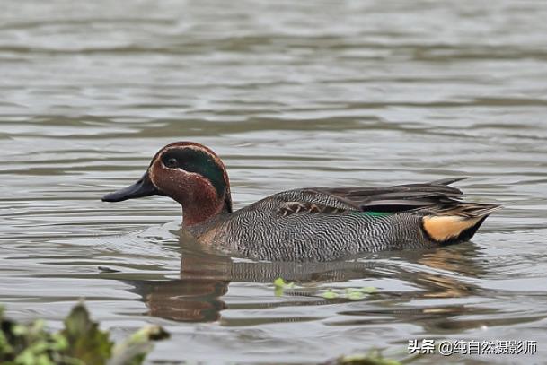 绿翅鸭(学名:Anas crecca)是小型鸭类,体长37厘米,体重约0.5千克。嘴脚均为黑色。雄鸟头至颈部深栗色,头顶两侧从眼开始有一条宽阔的绿色带斑一直延伸至颈侧,尾下覆羽黑色,两侧各有一黄色三角形斑,在水中游泳时,极为醒目。