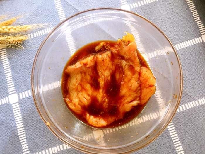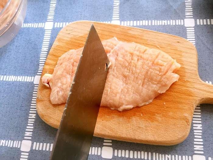 将鸡胸脯肉横切成薄片,用刀背轻轻捶打使肉质松软使其更加入味。