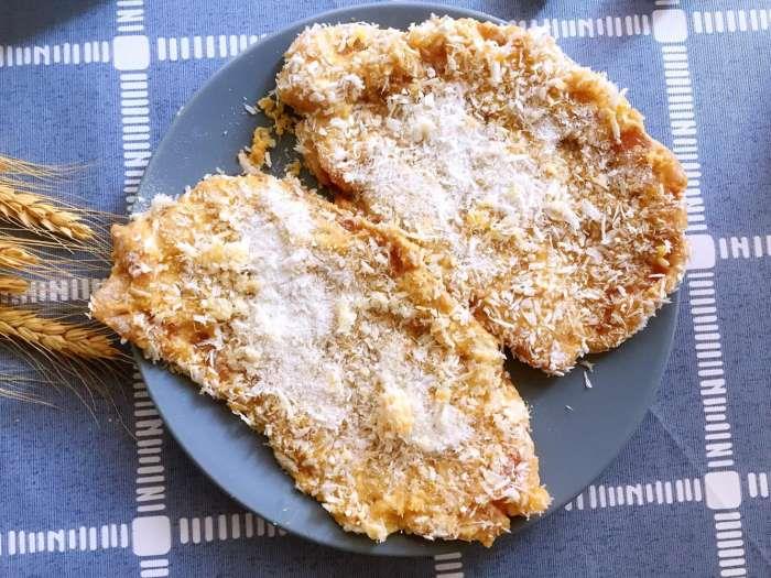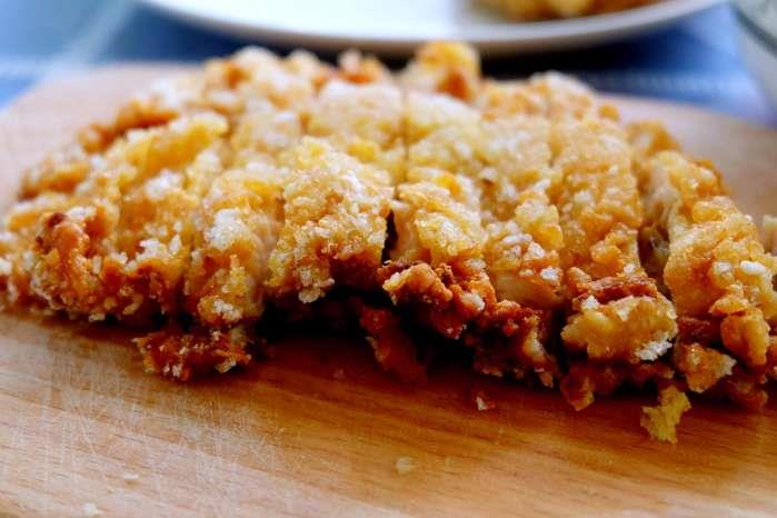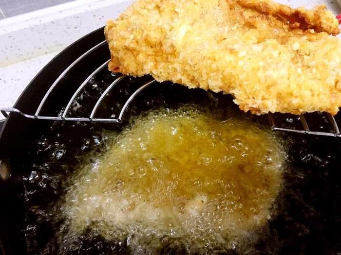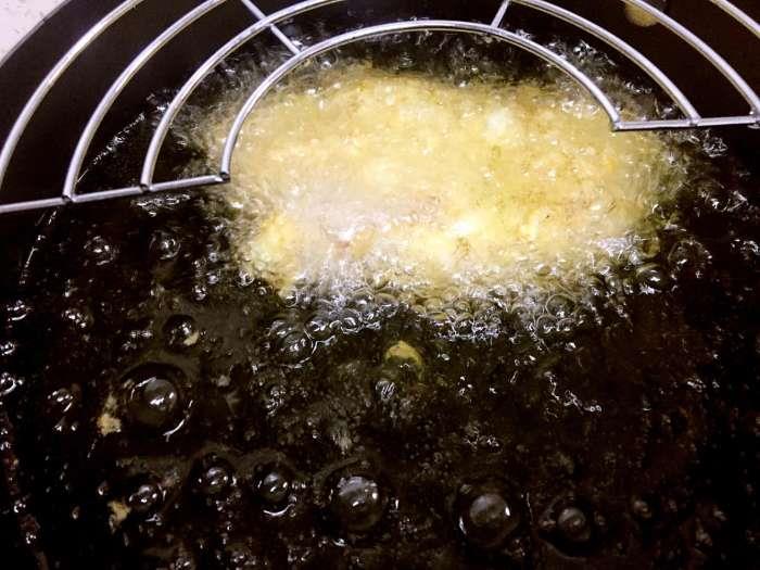 锅中多放一些油,烧开后,放入鸡胸脯油炸,中途不断翻面以防炸糊了。