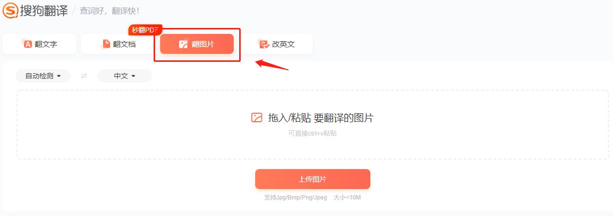 操作也很简单,找到翻图片功能,将需要翻译的图片拖动至指定区域或点击上传图片