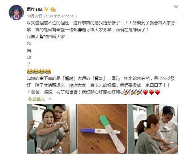 去年10月份,Ella晒出验孕棒并配文称:“以我这个藏不住的个性,这件事真的把我给憋惨了!!!时间到了就会跟大家分享,真的是因为希望一切都稳定才跟大家分享,而现在是时候了!我要大声的告诉大家:我怀孕了。知道的当下真的是“惊吓”大过于“惊喜”,因为一切来的太突然,呆坐在沙发好一阵子才清醒过来,谢谢大家一直以来的祝福,我们要变成一家四口了!!(爸爸、妈妈、布丁和宝宝)我好开心好开心好开心。”
