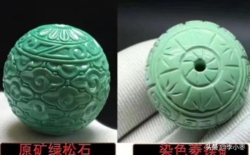 事实真相:菱镁矿和绿松石没有丝毫关系,染色后打着绿松石的名号自抬身价,完美掩盖与原矿绿松石相比的价格差异,后续的入水变色、盘玩变色更是利用人类固有的虚荣心理,达到售假目的。