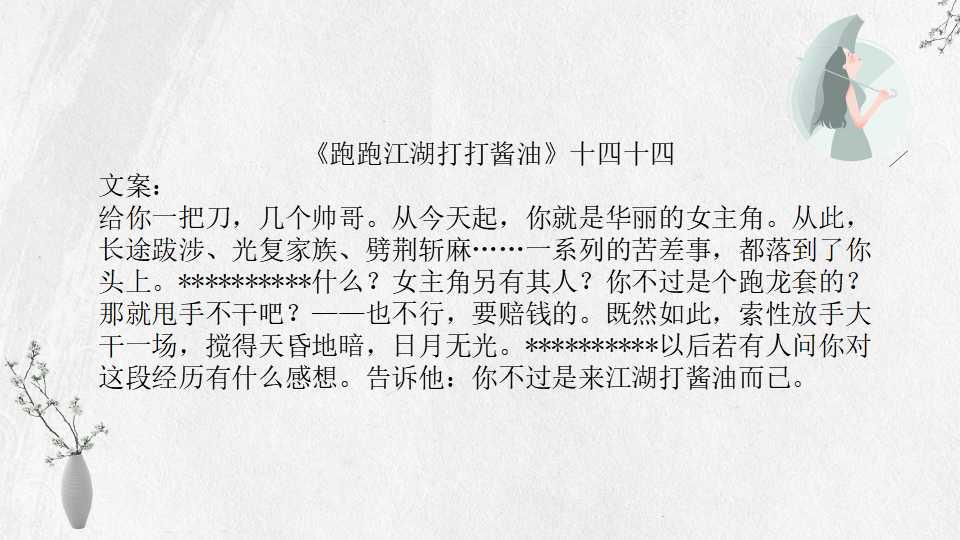 2、 《跑跑江湖打打酱油》十四十四 49万字 BG 完结