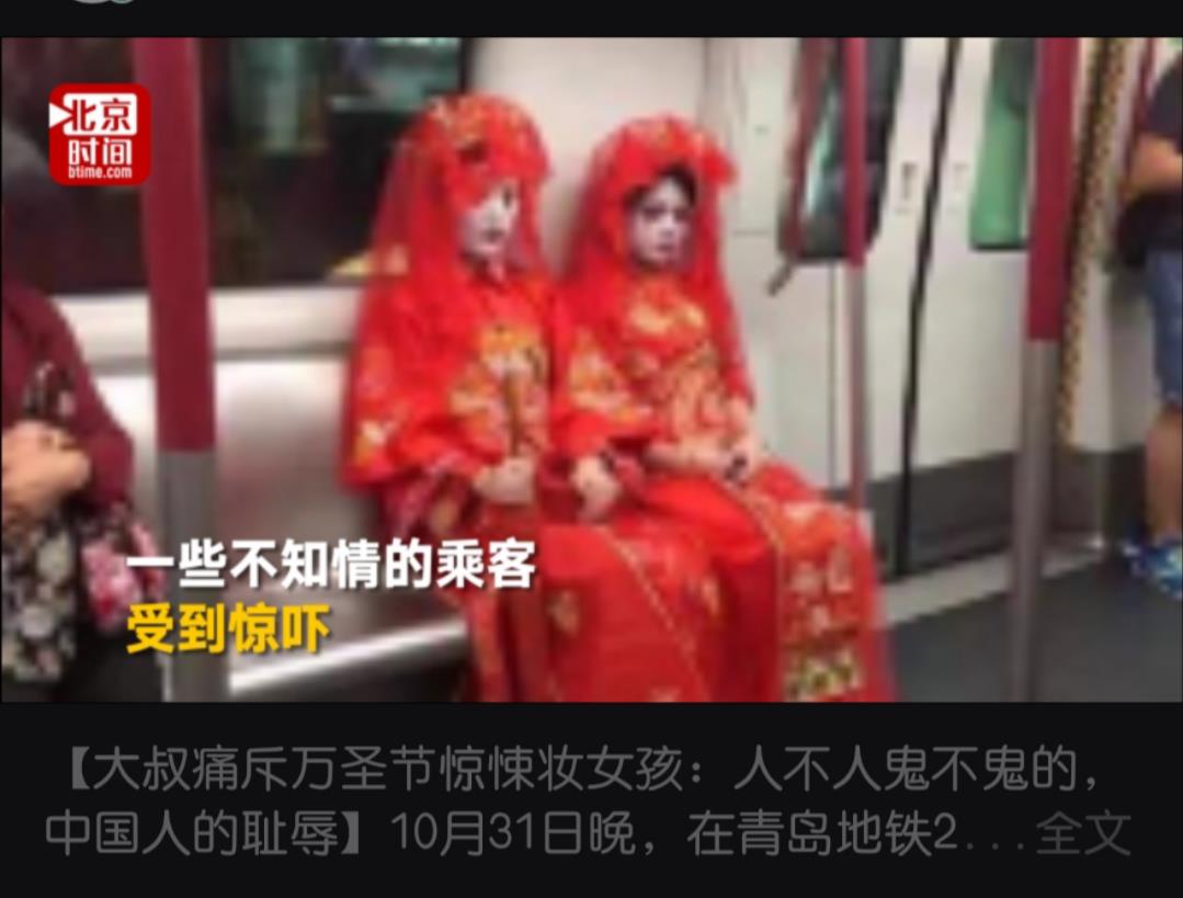 近日,在青岛地铁2号线上,一中年男子因看不惯地铁里万圣节的女孩,指责对方“人不人鬼不鬼的,是中国人的耻辱”,女孩则反驳“要你管,你闭嘴”。