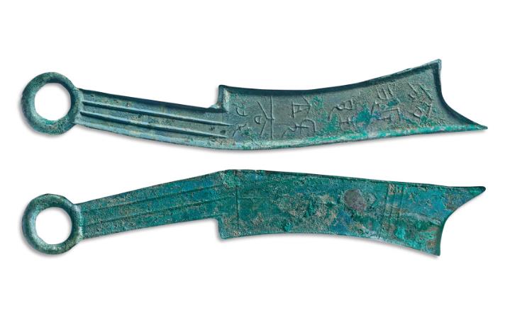 战国的齐大刀一直都是先秦货币中的名誉品,六字刀更位列中国古泉五十名珍,这枚六字刀是“齐返邦长大刀”背面的文字是“上”字,钱币通长186.1mm,重达到了44.1克!齐大刀分为三字刀到六字刀不同的品种,字数越多,也就越少见!