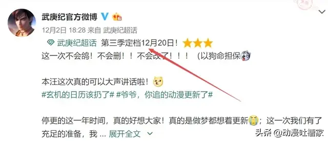 而在前段时间里,也刚刚好,官方的微博放话了,宣布了《武庚纪》第三季的定档时间,第一次的定档是定在今年12月13日的,这算是一个很好的消息了,也就是说将会在定档的时间里就能看到《武庚纪》第三季的开播了,但是好景不长,在官方的微博没公布多久,官方就把这条定档的时间给删除了。