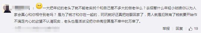 称:“一大把年纪的老头了就不能老实找个和自己差不多大的做老伴么?去招惹什么年轻小姑娘你以为人家会真心和你相守到老吗? 是为了钱才和你在一起的,玩玩就好还真把她娶回家了,男人就是犯贱有了钱就要开始作不满足内心的欲望不认清现实,老头也是活该没把你命掏空算是不幸中的万幸了。”