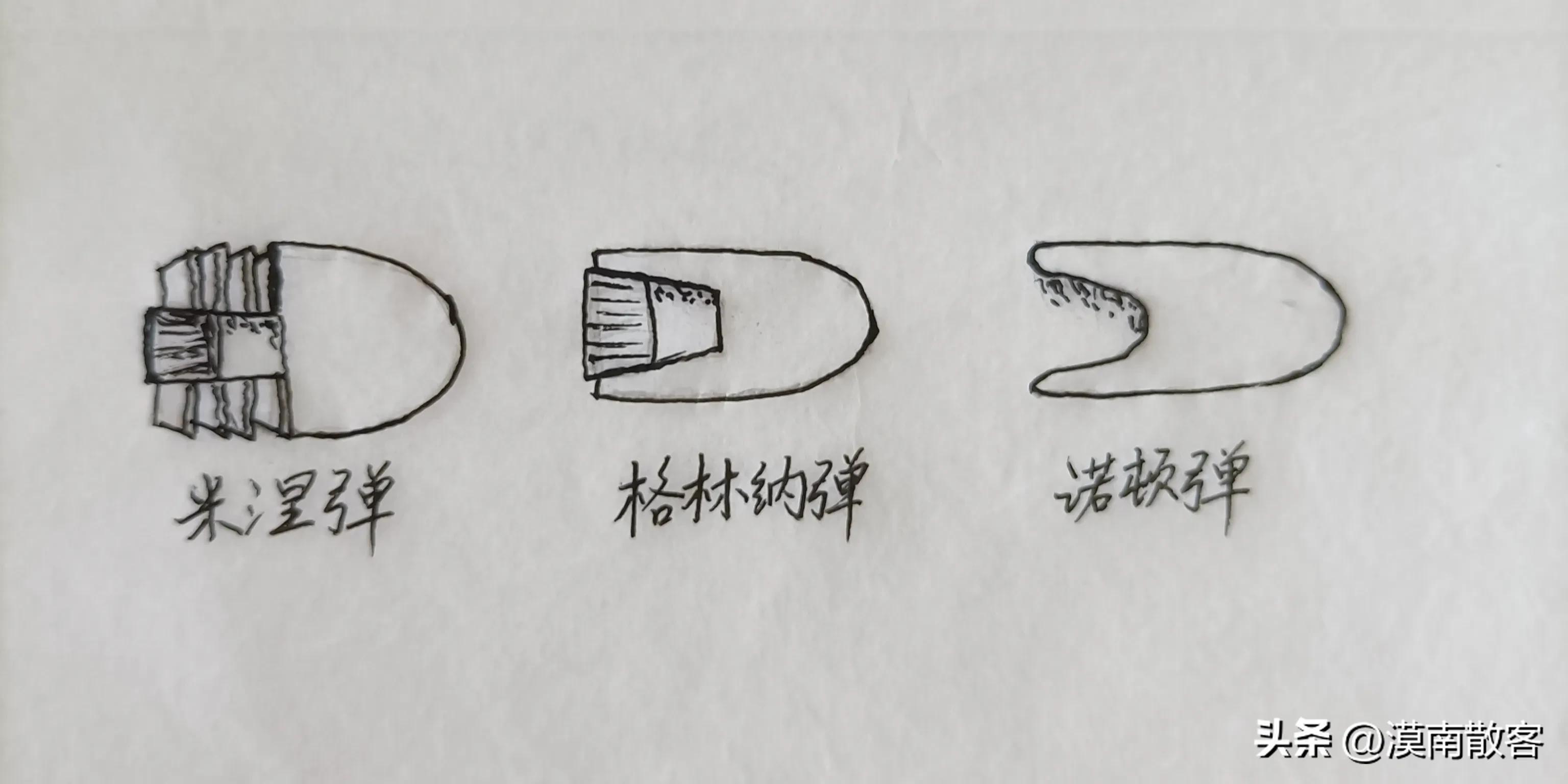 1823年,英国诺顿船长发明了一种弹尾中空的锥形弹头,也就是诺顿弹。诺顿弹在发射时,火药燃气冲入尾部腔体迫使其向外扩张,进而嵌合在线槽内并沿着膛线旋转着射出。这种设计:弹尾膨胀密封枪膛增大膛压、锥形弹体符合空气动力学飞得更远、螺旋形的飞行方式增强了弹体的稳定性,为子弹未来的发展奠定了基础。1836年,英国制枪师格林纳又改进了诺顿弹,在弹尾空腔内加装锥形木塞以增强扩张效果,这就是格林纳弹。1849年法军上尉米涅在格林纳弹的基础上增加了弹尾外壁的凹槽,这种设计减小了弹体和枪管的磨擦力,这就是有名的米涅弹。米涅弹是次口经弹(弹径略小于枪膛口径),装填和滑膛枪一样方便。而米涅弹的射程和精准度是滑膛枪无法比拟的。所以在当时米涅弹和线膛枪的结合堪称完美。
