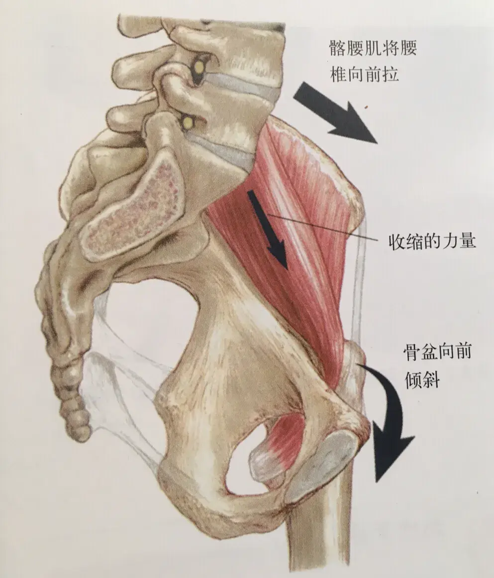 腰肌连接到腰椎,下行通过腹腔到达腹股沟,在此处它与髂肌融合并通过髂骨前缘,然后向后下方斜行连接到股骨小转子。以这种方式,它将髂骨的前缘问作为滑车,运用一个向后下方的力量顶住它。因此,通过向前拉腰椎和向下、向后压髂骨的前下方,使骨盆向前倾斜并使腰曲发生脊柱前凸。