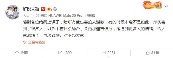 但是谁又能想到,只是因为这一句话,米勒以及妻子的微博都遭到爆破,而米勒迫于压力也是发博道歉:感谢各位给我上课了,给所有受伤害的人道歉,有的时候本意不是如此,却伤害到了很多人。以后不管什么场合,会更加谨言慎行,考虑到更多人的情绪。给大家添堵了,再次致歉。对不起大家!