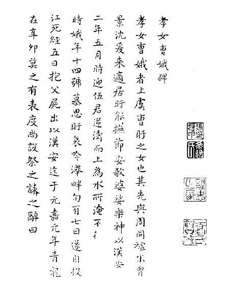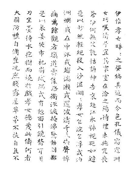 伊惟孝女,奕奕之姿。偏其反而,令色孔仪。窈窕淑女,巧笑倩兮。宜其室家,在洽之阳。大礼未施,嗟伤慈父。彼苍伊何?无父孰怙!诉神告哀,赴江永号,视死如归。是以眇然轻绝,投入沙泥。翩翩孝女,载沉载浮。或泊洲渚,或在中流。或趋湍濑,或逐波涛。千夫失声,悼痛万余。观者填道,云集路衢。泣泪掩涕,惊动国都。是以哀姜哭市,杞崩城隅。或有尅面引镜,剺耳用刀。坐台待水,抱树而烧。