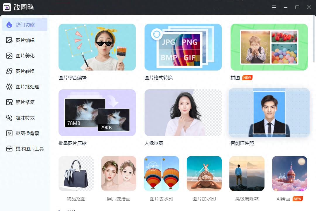 改图鸭是一款优秀的编辑图片应用软件,操作简单功能强大,包括图片压缩、图片编辑、图片格式转换、照片修复、图片涂鸦、抠图换背景和其他特色功能,能够满足用户90%图片处理需求。