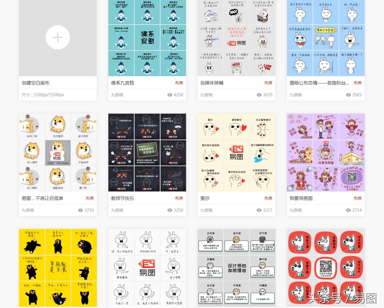 易图有其他同类在线图片编辑网站所没有的九宫格模板,都是易图设计师原创手绘,画风可爱、文案诙谐有趣,可以直接下载发朋友圈。