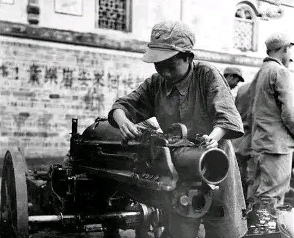 一名少年兵在擦拭炮筒
