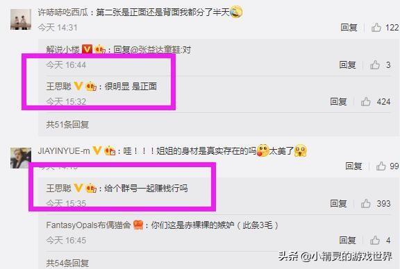 近日,小楼在微博中晒出了昔日的美照,网友们纷纷在下面夸赞小楼的身材好,长得太美了,而王思聪在看到这些评论之后,也是立马评论到:“给个群号一起赚钱行吗?”不过也有网友调侃到,分不清小楼照片上拍的自己是拍正面还是拍背面了。而王思聪看到后,也是评论到,很明显是正面。不得不说,这两人的关系是真的好啊!不然谁还会刻意去开这样的玩笑呢?不是吗?