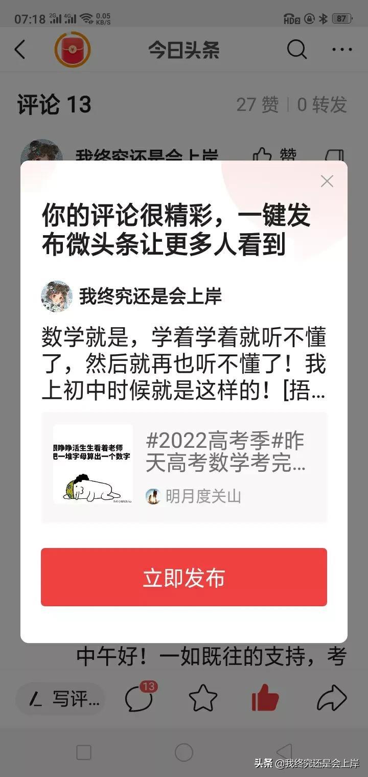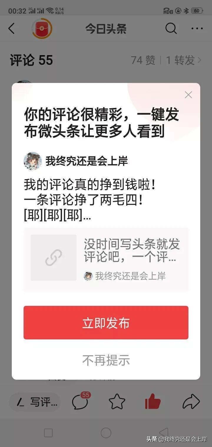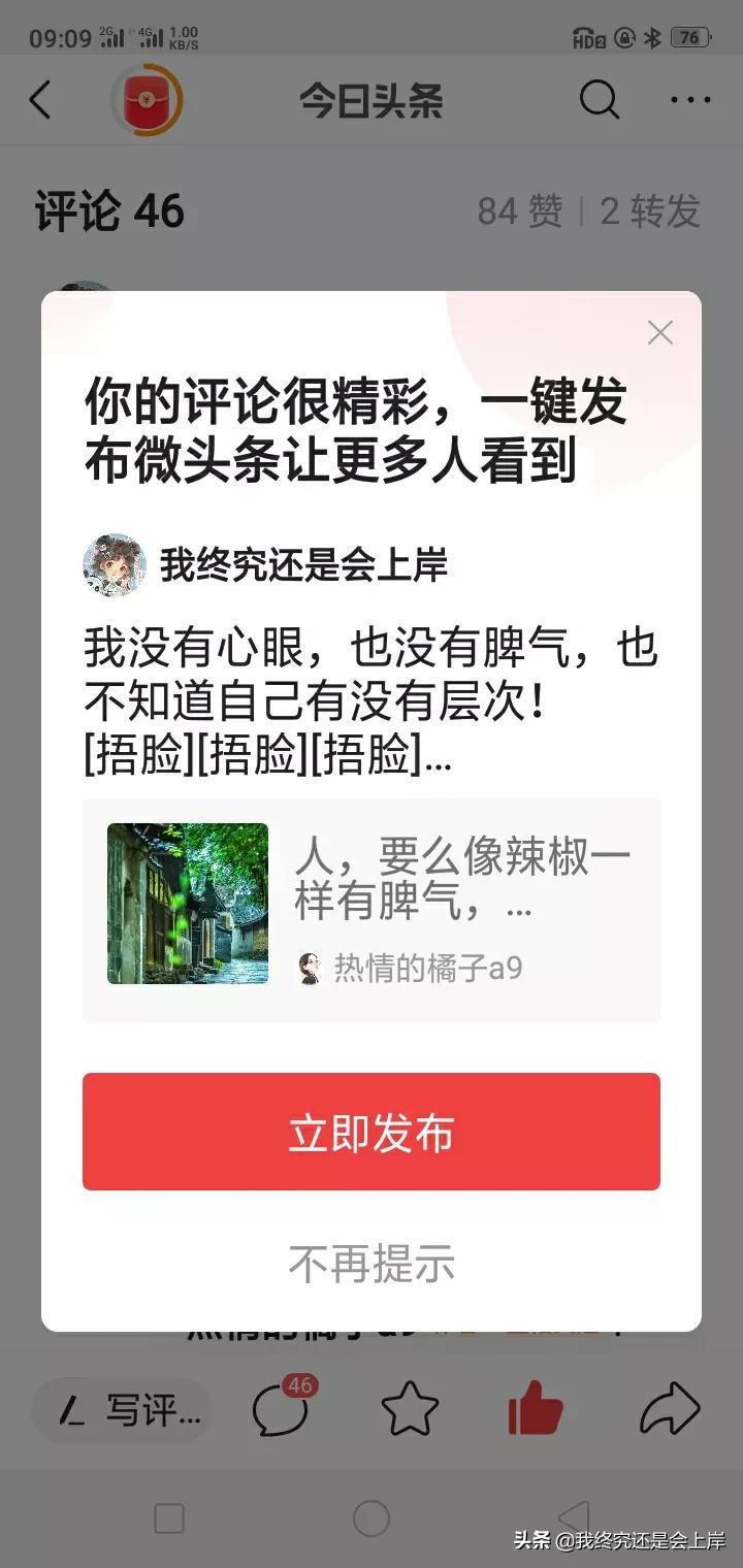 6月7日中午,我给友友写的一条评论,评论发出去后,头条显示“你的评论很精彩,一键转发微头条让更多人看到吧!”