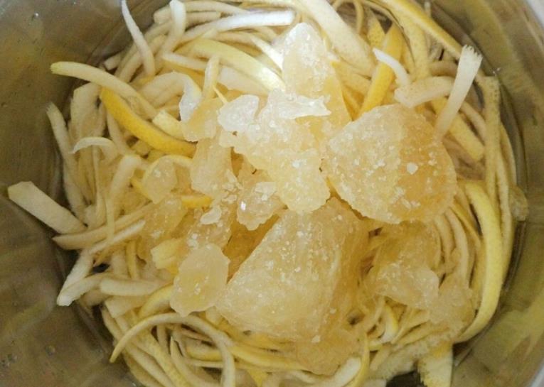然后再次准备一锅清水,放入柚子皮,继续煮开,稍等一会再次捞出沥干水分,然后放在平底锅内,放入适量的糖,挤入适量的柠檬汁,然后倒入适量的清水。