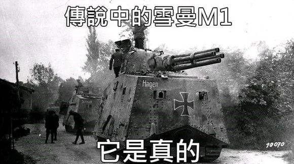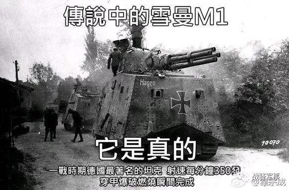 而实际答案是来自我们脑洞大开的制片厂商搞的抗战神剧中的场景,教官一本正经地给士兵们讲一战时期德国最著名的坦克“谢尔曼M1,每分钟射速350发,穿甲爆破燃烧瞬间完成”,一时间“德国谢尔曼”的梗在军迷圈子里炸开了锅。