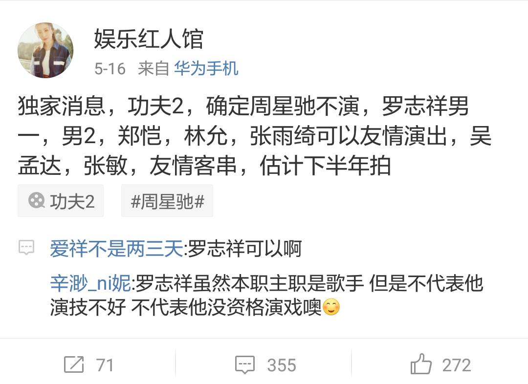 最新的独家消息:《功夫2》继续由罗志祥出演,增加男2号郑凯,林允和张雨绮将会在里面友情演出,而吴孟达,张敏则会在里面客串,预计下半年开拍。很遗憾,星爷还是不会出演,也许是真的厌倦演戏了,现在只想提拔提拔新人。罗志祥也许就是星爷看好接班人。
