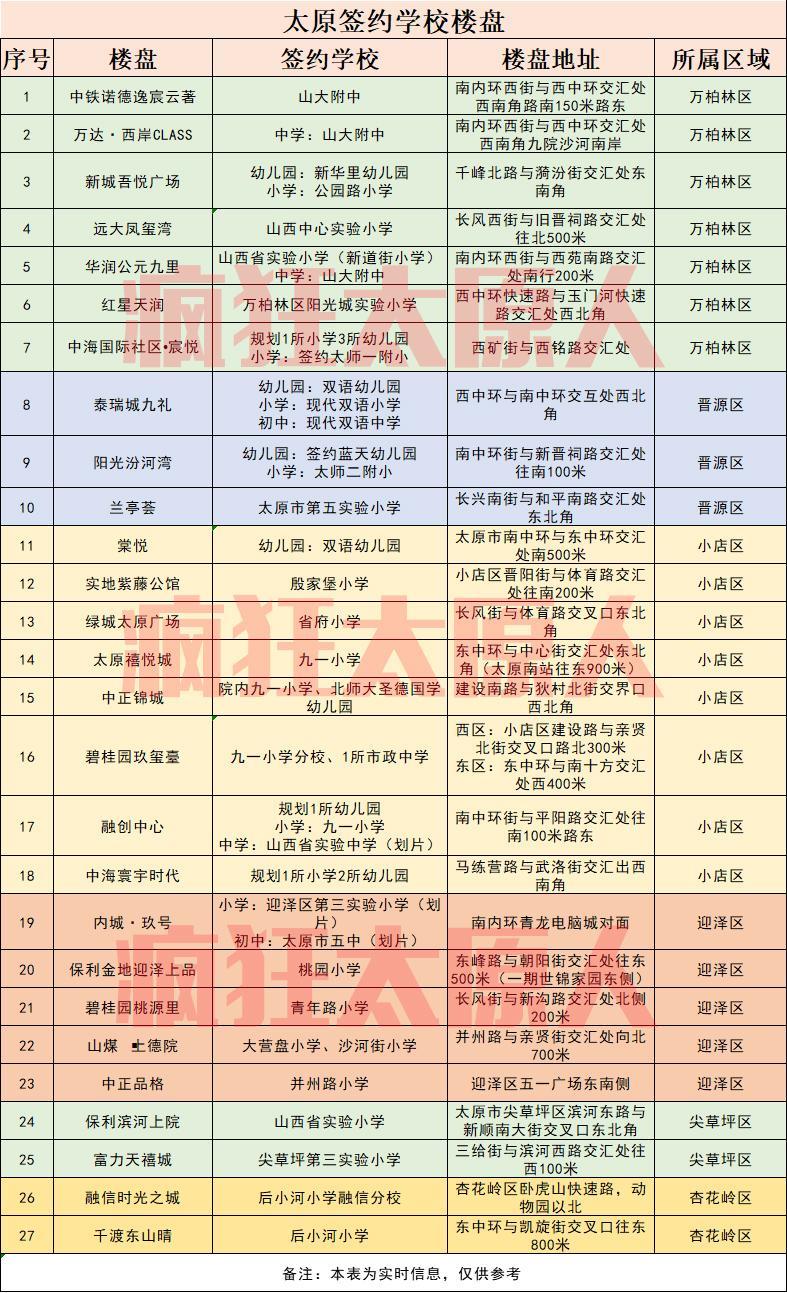 太原楼盘签约学校一览表,27个楼盘可以选择