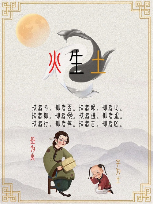 火生土。用人世间的理解,可以理解为火是土的母,土是火的子。