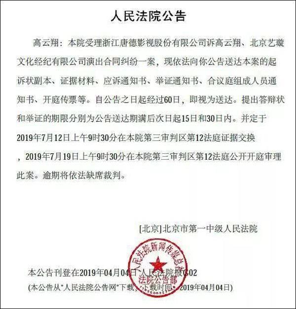 2019年4月4日,北京市第一中级人民法院上传公告,正式受理了电视剧《巴清传》投资方唐德影视诉高云翔及北京艺璇文化经纪有限公司的演出合同纠纷一案,并定于2019年7月12日进行证据交换,7月19日9点30分公开审理。