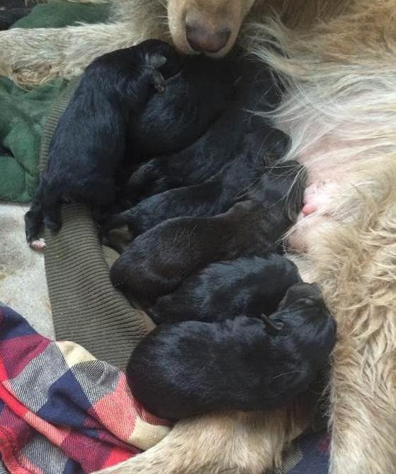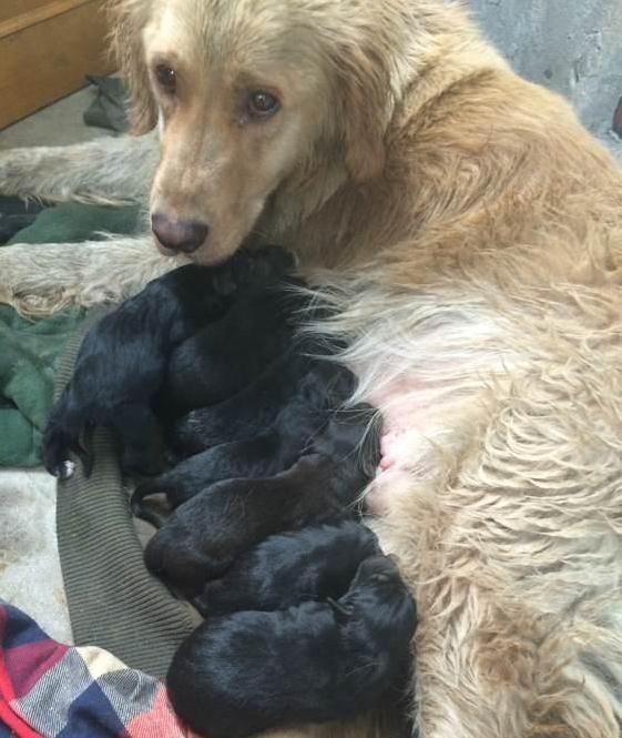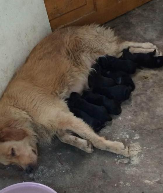 女子走上前去,几只黑色金毛正偎依在麻麻身边吃奶。