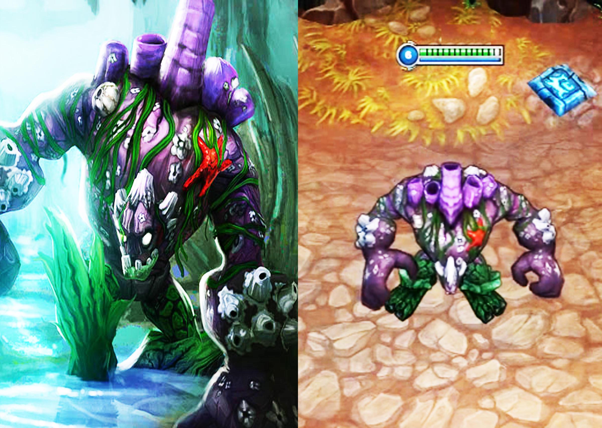三:石头人的珊瑚礁皮肤。这个英雄的皮肤数量还是比较少的,而且有特效的还是很少的。其中有特效的皮肤就是冰川巨兽和霸天巨兽这两款皮肤。这个英雄想要做出有特效的皮肤的话,还是有难度的。那么这个英雄的皮肤当中,原画和模型最不相符的就是珊瑚礁这款皮肤了。珊瑚礁这款皮肤然很多玩家都感觉受不了。因为这款皮肤的原画的画风实在是太诡异了。有密集恐惧症的玩家更是无法接受这款皮肤。