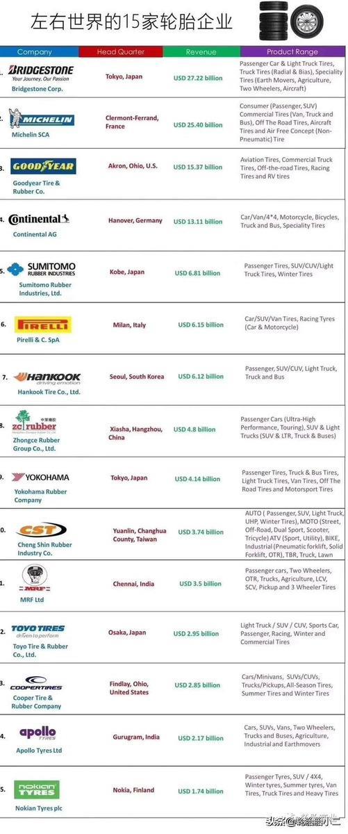 一般轮胎都会在侧壁上印上其生产厂商的英文商标,影响世界的十五家轮胎企业,看看你认识几个?