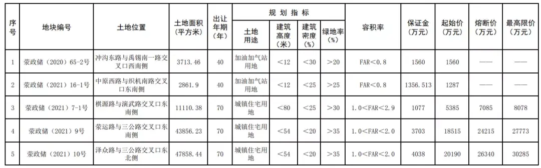 2021年11月25日,经荥阳市人民政府批准,荥阳市自然资源和规划局、荥阳市公共资源交易中心决定以网上挂牌方式出让五宗(2宗加油加气站用地、3宗城镇住宅用地)国有建设用地使用权,面积合计109400.41平方米,起始价合计46937万元。