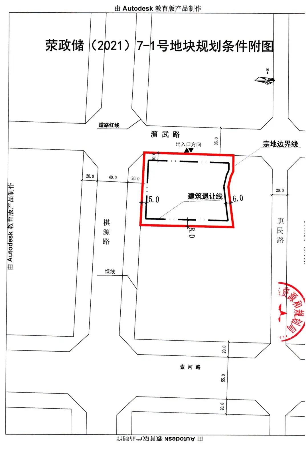 荥政储(2021)7-1号土地位置在棋源路与演武路交叉口东南侧 ,土地面积11110.38平方米,出让年期70年,土地用途为城镇住宅用地,建筑高度<80米,建筑密度<25%,绿地率>30%,1.0<容积率<2.9,起始价5385万元。